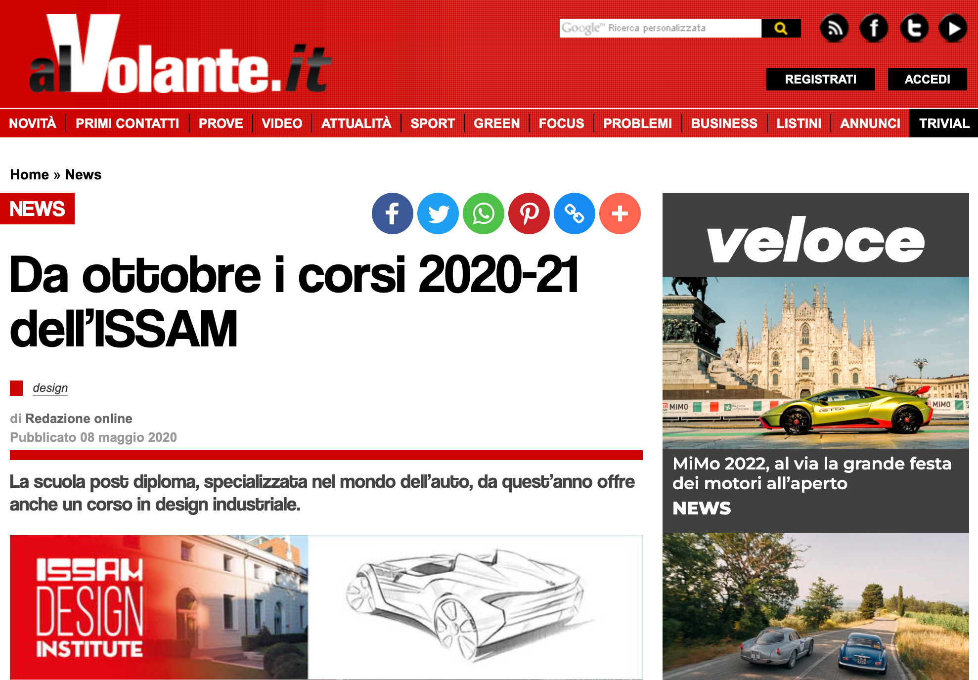 DOPO IL DIPLOMA – Oltre all’università e al master, ci sono altre strade per prepararsi a lavorare nel mondo dell’auto. Una di queste sono i corsi post-diploma della scuola Istituto Superiore di Scienza dell’Automobile di Modena (abbreviato in ISSAM), che organizza due noti programmi di studio: lo Stylist Engineering, rivolto a chi vuole imparare il disegno grafico e tecnico della carrozzeria; e l’Automotive Engineering, in cui si affronta la progettazione meccanica di motore, telaio e dell’auto. Nuovo per l’anno accademico 2020-21 è il corso in Industrial Design, per chi vuole applicarsi nella progettazione di oggetti non legati al mondo dell’auto: sono previsti corsi di rendering, disegno tecnico, ergonomia, tecnologia dei materiali, modellazione 3D, qualità del prodotto e tecniche di prototipazione rapida.